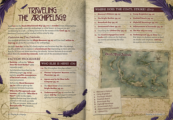Instead, the module gives you procedures for faction activity, travel, and naval encounters so the world keeps moving around the PCs. The story isn’t pre-written and can only be understood as something that happened at your table in the past-tense, rather than something that the GM dictates will happen.